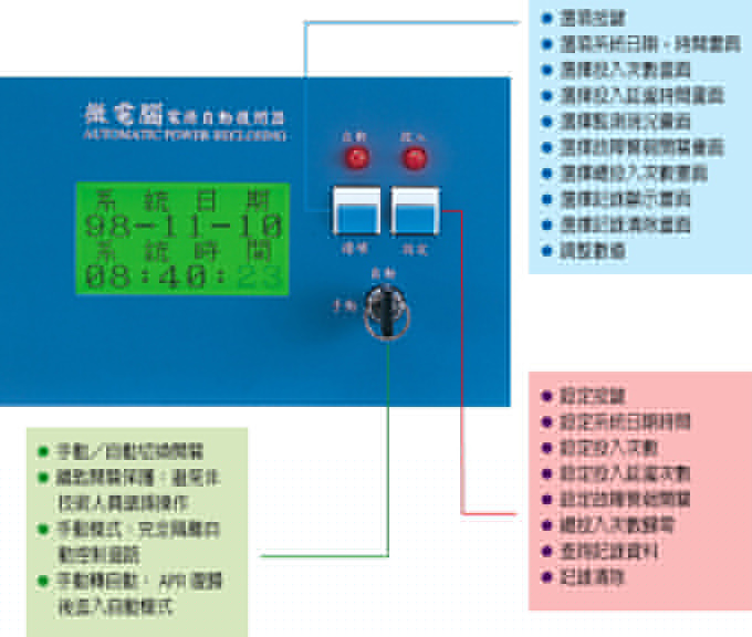電壓異常,負載事件,投次已滿有一輔助接點提供遠距離警報告知使用,並可設定切換警報開啟或關閉。可外接自動求救系統。 |